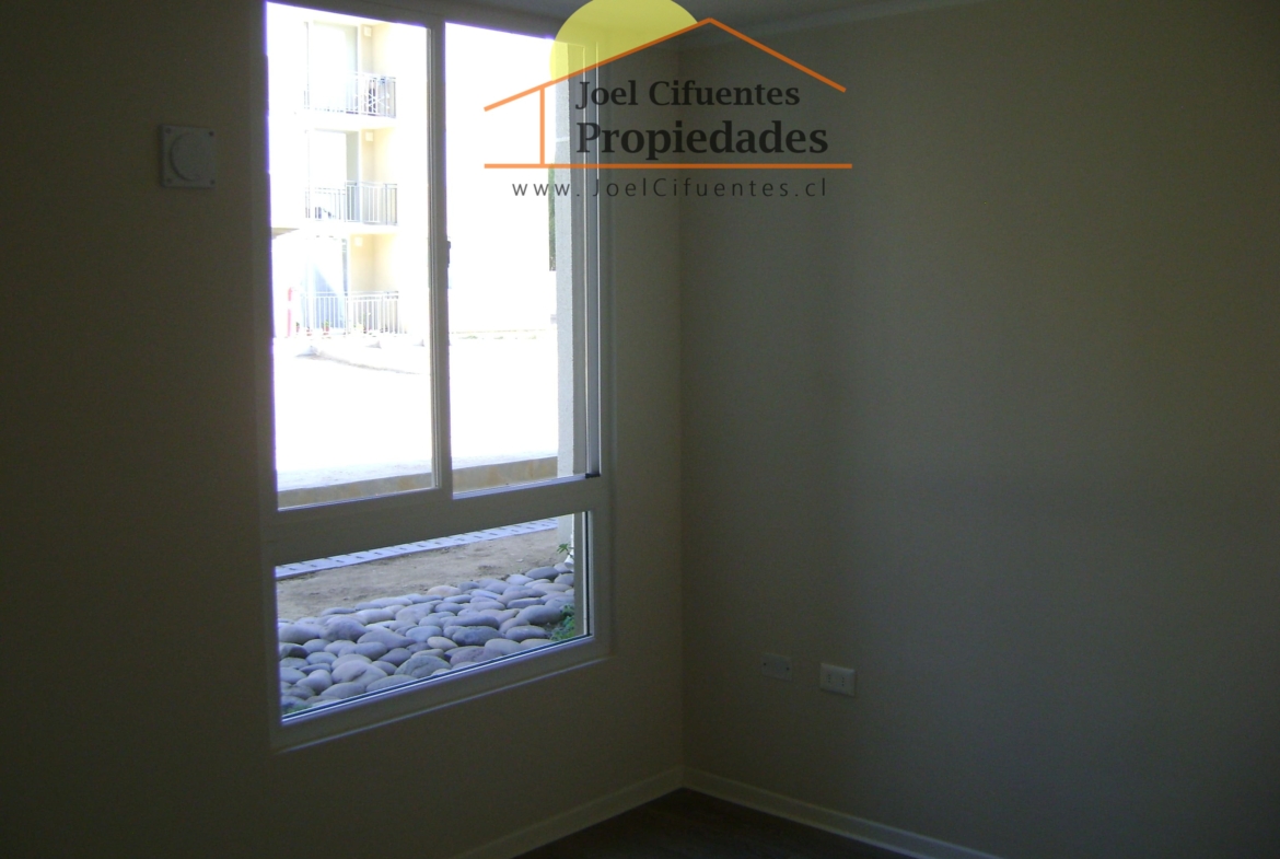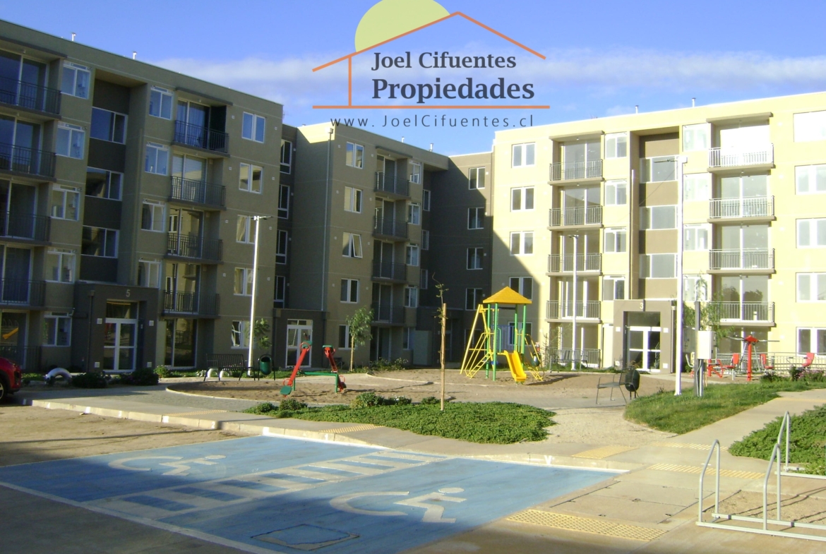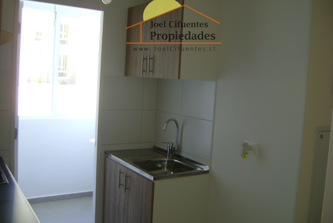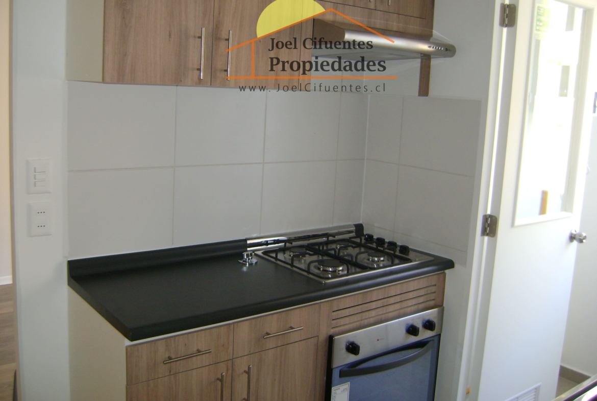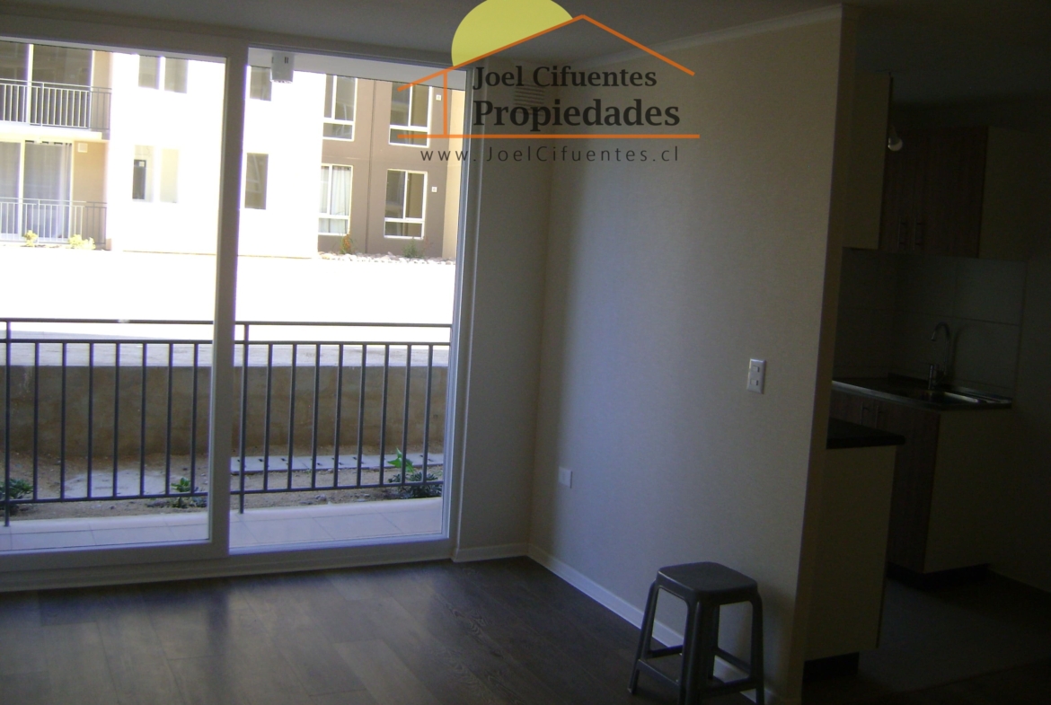 Departamento nuevo, 1er piso, living comedor, terraza, cocina amoblada y equipada (horno, encimera y campana), 2 dormitorios con closet, 1 baño, estacionamiento. El condominio cuenta con conserjes 24 horas, cerco perimetral eléctrico, 2 quinchos, club house y juegos infantiles.
