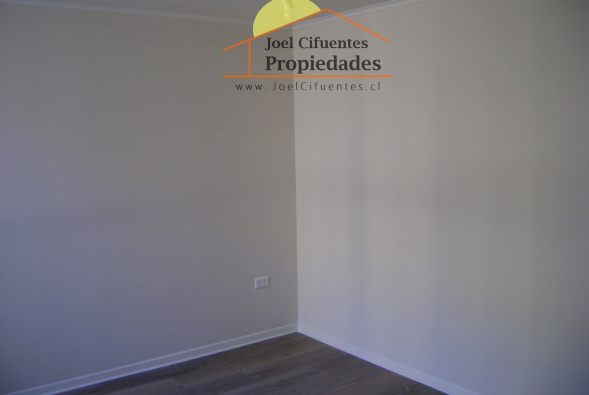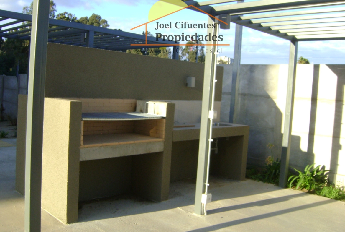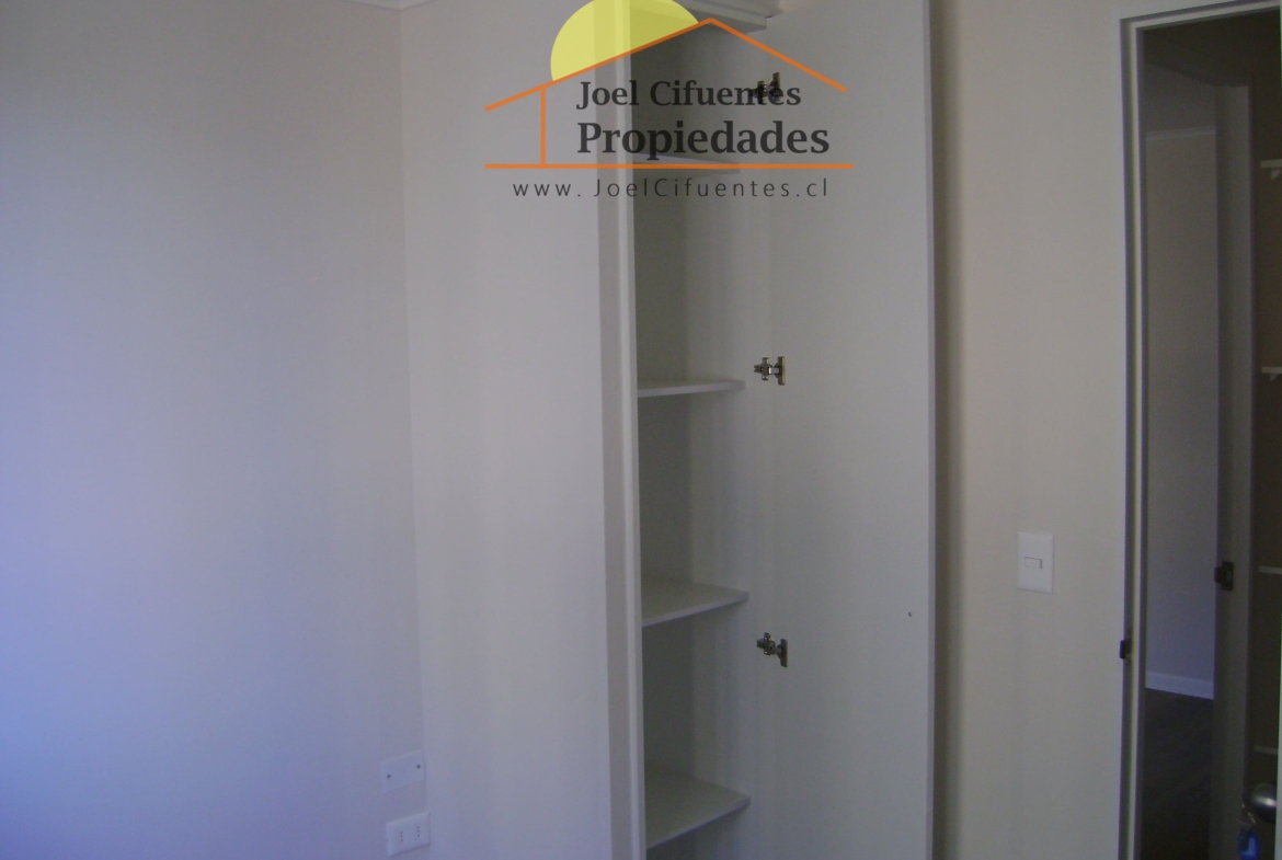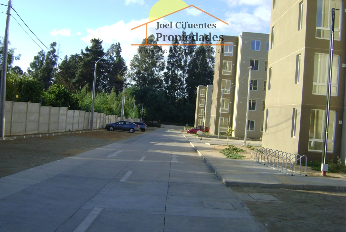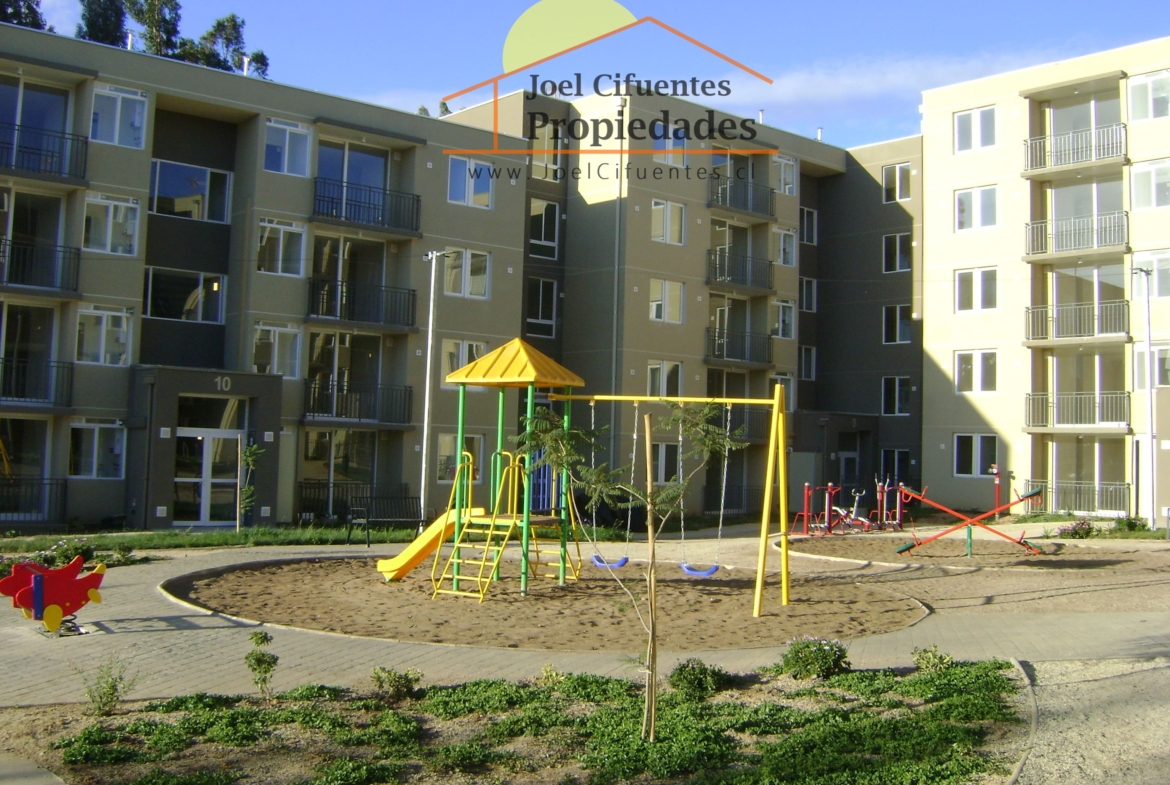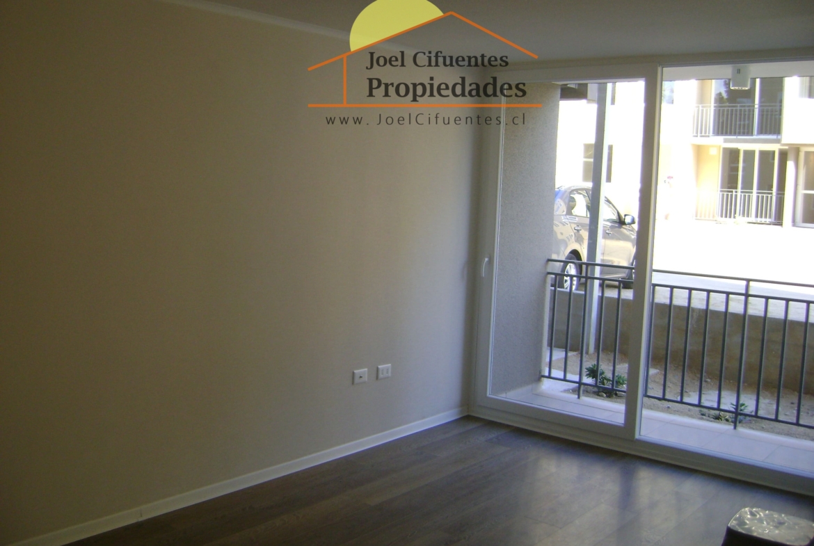 Departamento nuevo, 1er piso, living comedor, terraza, cocina amoblada y equipada (horno, encimera y campana), 2 dormitorios con closet, 1 baño, estacionamiento. El condominio cuenta con conserjes 24 horas, cerco perimetral eléctrico, 2 quinchos, club house y juegos infantiles.